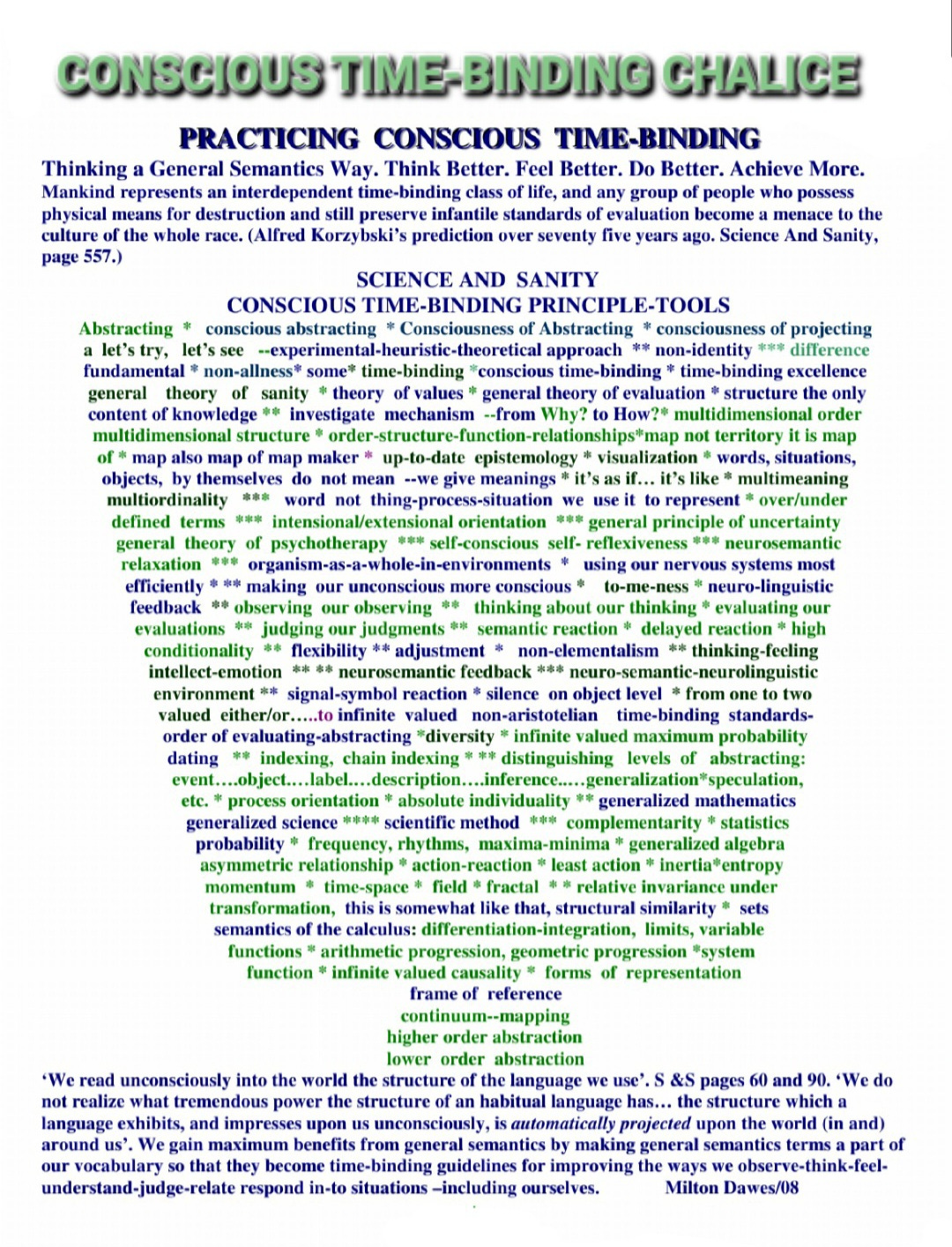 * Human excellence as conscious time-binding excellence: We live our lives based on our maps: sensory, verbal, psychological, religious, belief, prejudicial, mystical, mythical, superstitious, emotional, epistemological, scientific, and other ‘maps’. Ironically “Our maps are not the territories they are maps of”. “Our words are not what we use them to represent”. I think it’s worth emphasizing: The more often we remember to behave from this time-binding frame of reference, this field of viewing, the closer I believe we approach what I consider Korzybski to ‘mean’ by “time-binding excellence” and “human excellence”. Conscious time-binding ethics: Following a conscious time-binding ethics, we do not work at developing better and better weapons of war, and ways to destroy each other. We use our conscious time-binding skills to better understand ourselves and improve our relationships with ourselves, with others, and the world: We can use our conscious time-binding skills to explore ways to becoming better at communicating, understanding, and relating, to avoid or minimize conflicts, disputes, violence, and wars. We improve our driving, our golfing, communicating, whatever we do, not just by writing, defining and talking—but in doing. Similarly we improve ourselves, we benefit by consciously using general semantics time-binding principles in our day to day interactions. Sanity of the race starts with sanity of individuals. I invite you to practice verbalizing the attached time-binding principles. And ‘time-bindingly’ evaluate all of the above as conscious time-binding starting points and proposals.