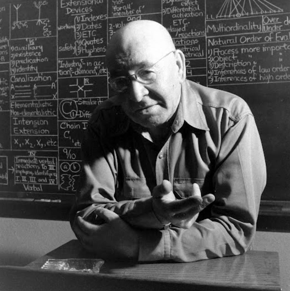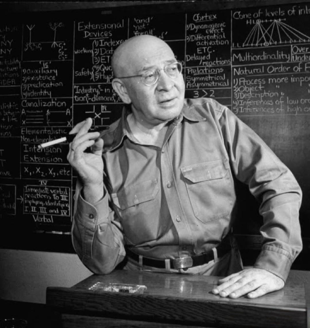 Some text visible on the blackboard behind Alfred Korzybski from picture of Life magazine cover, July 1944 [revision on-going, revisit/refresh,.]: